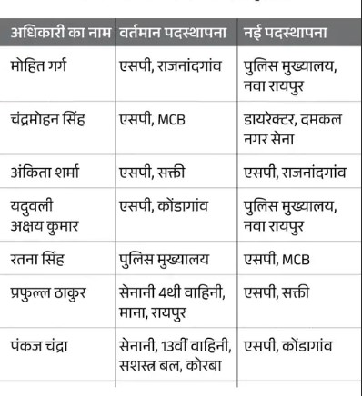 आदेश के अनुसार वरिष्ठ पुलिस अधीक्षक मोहित गर्ग को राजनांदगांव से DIG पुलिस मुख्यालय (मुख्यालय अटैच) किया गया है। वहीं मनेंद्रगढ़-चिरमिरी-भरतपुर के एसपी IPS चंद्रमोहन सिंह को दमकल-नगर सेना का डायरेक्टर बनाया गया है।