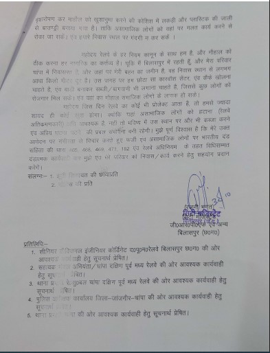 दूसरी ओर, शबीना भगत ने स्वयं को उक्त भूमि की वैध स्वामिनी बताते हुए रेलवे मंडल प्रबंधक बिलासपुर को एक विस्तृत आवेदन दिया है। अपने आवेदन में उन्होंने कहा है कि उनके द्वारा रेलवे के निकट की 28.25 डिसमिल भूमि उसके भूमिस्वामी से वैध रूप से खरीदी गयी है जहाँ पर निर्माण सामग्री रखी गई थी, जिसे कुछ स्थानीय रसूखदारों और कथित रेलवे कर्मचारियों ने मिलकर क्षति पहुंचाई। उन्होंने लगभग 7 लाख की निर्माण सामग्री के नुकसान का दावा करते हुए इसकी भरपाई की मांग की है। शबीना ने यह भी आरोप लगाया है कि क्षेत्र में पहले से कई लोग रेलवे भूमि पर मकान, दुकान और होटल बनाकर बैठे हैं, मगर उनके विरुद्ध कोई कार्रवाई नहीं की जा रही। वहीं, एक आदिवासी महिला होने के नाते उन्हें लगातार धमकियां दी जा रही हैं, जो उनके मौलिक अधिकारों का हनन है। उन्होंने चेतावनी दी है कि यदि न्याय नहीं मिला तो वे न्यायालय की शरण लेंगी।