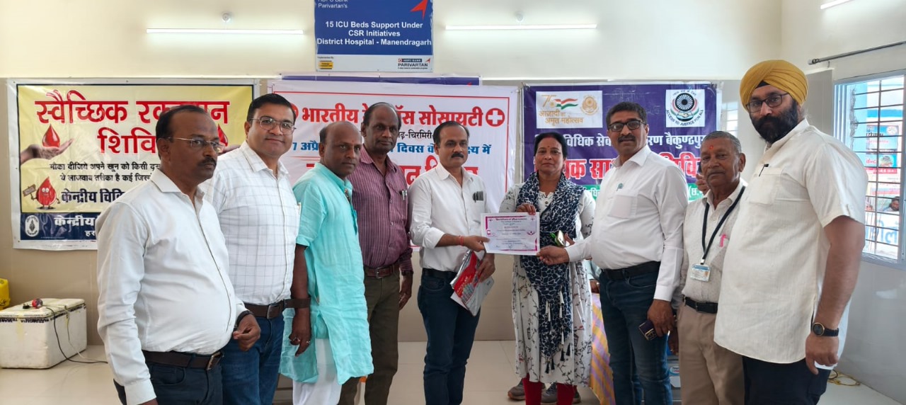 एमसीबी/07 अप्रैल 2025/ मनेन्द्रगढ़-चिरमिरी-भरतपुर जिले में आज विश्व स्वास्थ्य दिवस के अवसर पर भारतीय रेड क्रॉस सोसाइटी के द्वारा सामुदायिक स्वास्थ्य केंद्र मनेन्द्रगढ़ में एक बृहद रक्तदान शिविर का आयोजन किया गया। इस शिविर का आयोजन कलेक्टर डी. राहुल वेंकट के मार्गदर्शन एवं निर्देशानुसार किया गया, जिसकी शुरुआत चेयरमैन शैलेश जैन एवं मुख्य चिकित्सा एवं स्वास्थ्य अधिकारी डॉ.अविनाश खरे की उपस्थिति में हुई। शिविर में कुल ग्यारह (11) रक्तदाताओं ने स्वेच्छा से अपना रक्तदान किया, जिनमें जसपाल, रिंकेश खन्ना, विवेक जायसवाल, राजकुमार पांडेय, श्रीमती अंजनी यादव, रामनरेश पटेल, जयनारायण पांडेय, टी. विजय गोपाल राव, संजीत सिंह, जगदीप सिंह कोहली और हरीश गुप्ता शामिल रहे।